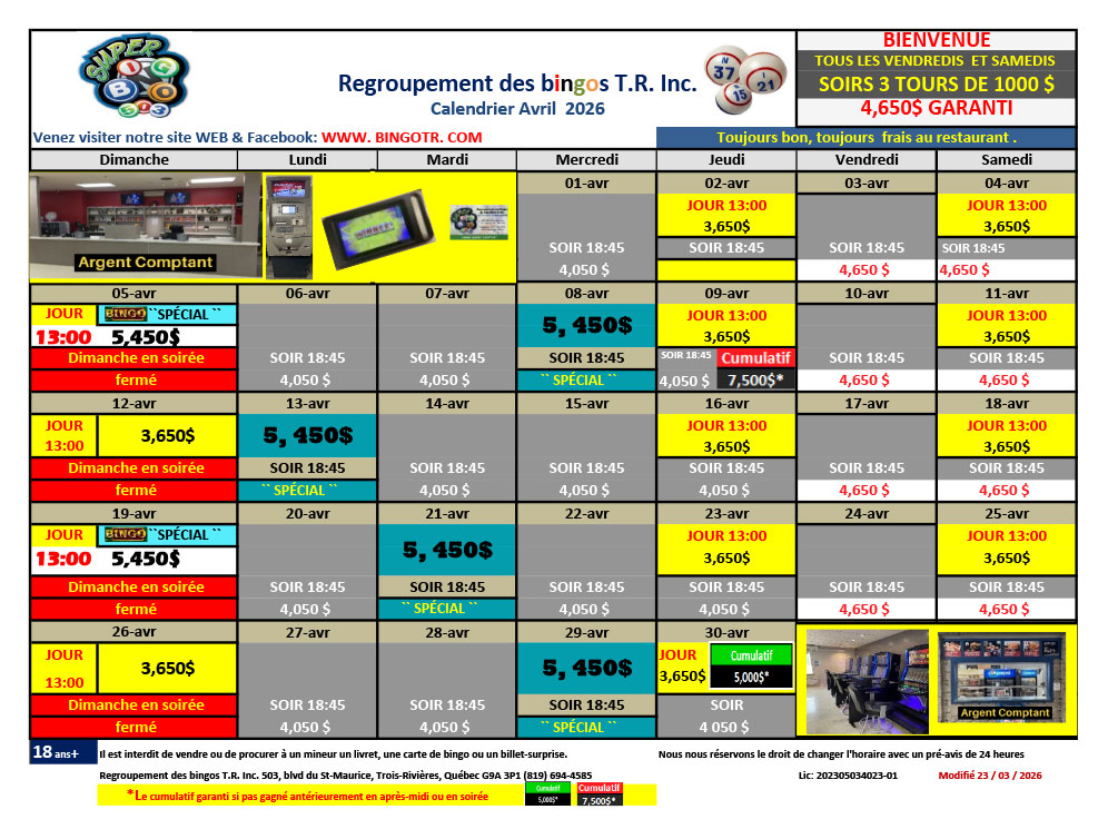 * En cas de disparité avec les montants affichés dans la salle, seuls les montants de la salle du bingo ont préséances.